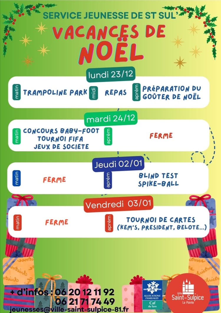 Le service jeunesse de la ville de Saint-Sulpice vous accueille les 23 et 24 décembre ainsi que les 02 et 03 janvier. Renseignements et inscriptions: jeunesses@ville-saint-sulpice-81.fr |