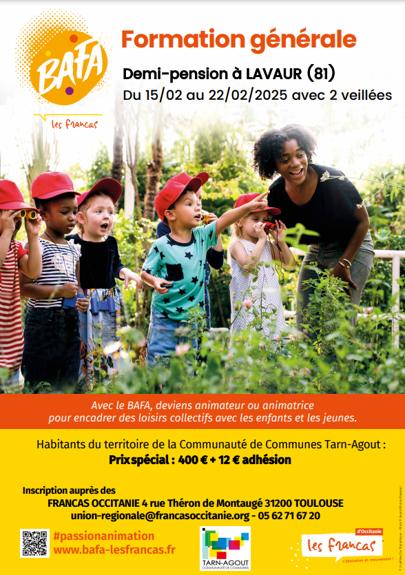 Envie de découvrir l’animation ou d’enrichir votre parcours ? La communauté de communes Tarn-Agout vous propose une session à Lavaur avec un tarif spécial pour les habitant du territoire ! renseignements et inscriptions: union-regionale@francasoccitanie.org |