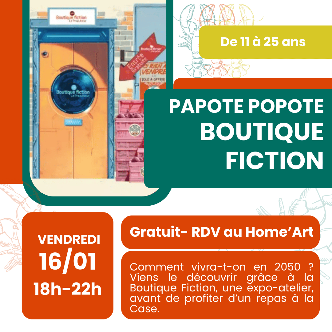 La Boutique Fiction, c’est une boutique qui nous propose de voyager en 2050 ! A quoi ressemblera notre vie dans ce futur pas si éloigné ? Quels seront les objets de notre nouveau quotidien ? A l’occasion de l’accueil de cette exposition à Saint-Sulpice, la MJC organise une soirée de découverte et d’atelier, suivi d’un repas à La Case. De 18h à 22h - Participation Libre. |