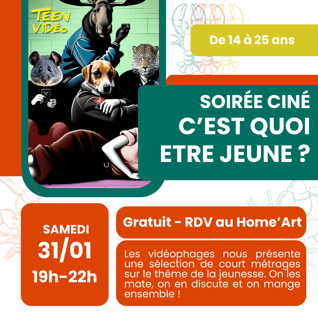 Dans le cadre de leur ciné itinérant “Le Colporteur d’ Images”, l’association Les Vidéophages nous présentent une sélection de courts métrages coup de cœur sur le thème de la jeunesse. “C’est quoi être jeune ?” et “Comment ça se filme ?” seront les thèmes de la soirée qui sera suivie d’un repas au Home’Art. Réservé aux plus de 14 ans. De 19h à 22h - Gratuit. |