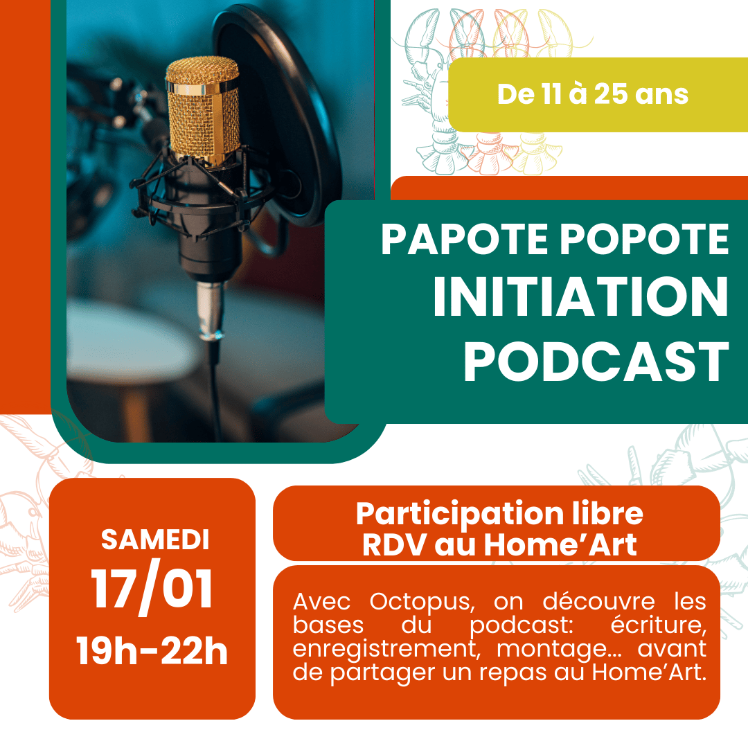 L’association Octopus nous propose de découvrir les bases du Podcast: écriture, enregistrement et montage, lors d’un repas au Home’Art. De 19h à 22h - Participation Libre. |