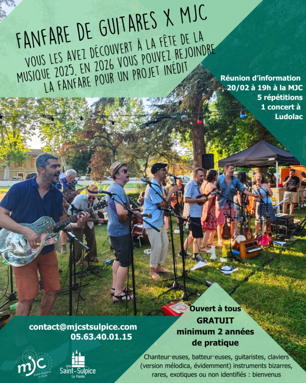 L’année dernière lors de la fête de la musique, les (nombreux-euses) musiciens-ennes de la fanfare de guitare nous avaient présenté leur répertoire, qui va de Britney Spears à des reprises de Kiss en grec… Cette année ils nous proposent d’intégrer la Fanfare ! Pendant les mois de mars à mai, plusieurs répétitions seront organisées en présence de la Fanfare pour travailler 5 de leurs morceaux avec l’objectif de les jouer sur scène pour l’ouverture de saison à Ludolac. La participation à ce projet est totalement gratuite, il suffit d’être adhérents-e, d’avoir au moins deux ans de pratique et d’être présent-e aux répétitions.
