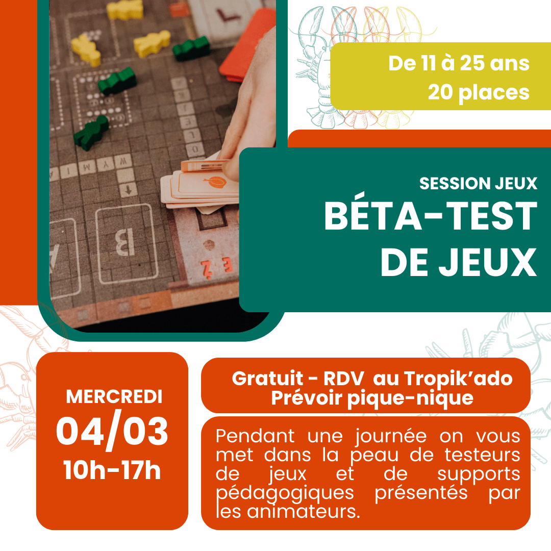 A la MJC, c’est bien connu, on aime les jeux. Les animateurs-rices en ont rassemblés des dizaines au fur et à mesure des années, sur de nombreuses thématiques… mais on a pas toujours eu le temps de les tester. On vous propose de consacrer une journée à ces tests. On a besoin de vos retours ! Rdv le 04/03 au Tropik’ado à partir de 10h, prévoir pique-nique, gratuit. |