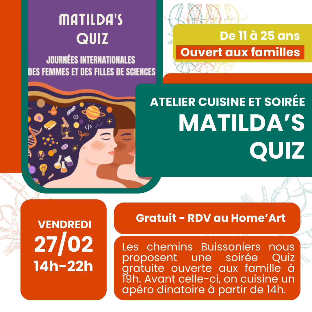 On se rejoint en début d’après-midi au Home’art pour concocter un apéro dinatoire. A partir de 19h, l’association “les chemins buissonniers” nous propose un quiz gratuit et ouvert aux familles sur la place des femmes dans l’Art et la Science, ponctué de rencontres. Le tout, bien sûr, en dégustant ce que l’on aura préparé dans l’après-midi. Rdv le 27/02, 14h pour la cuisine/19h pour le quiz, gratuit. |