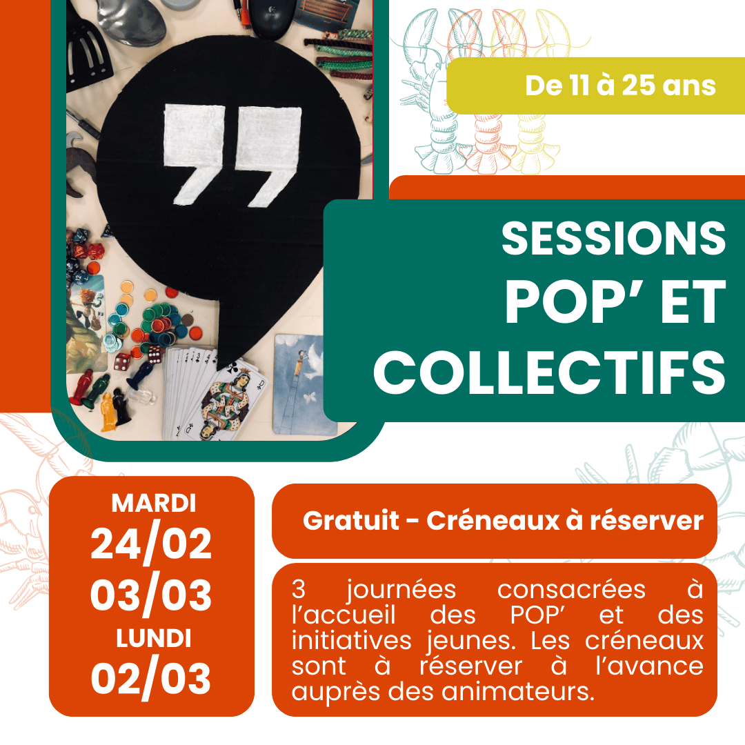 Pendant les vacances, des créneaux sont aussi consacrés à l’accueil de vos POP’, de vos réunions et/ou de vos initiatives. Pour réserver un créneau il suffit de contacter les animateurs-rices. Créneaux disponibles le mardi 24/02, le lundi 02/03 et le mardi 03/03. |
