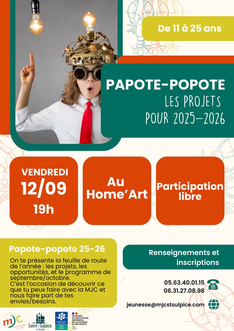 La MJC de Saint-Sulpice s’associe aux MJC de Gaillac et Graulhet pour te proposer d’écrire toi-même un projet européen ! Rassure toi, on va t’accompagner et prendre le temps: on se donne 1 an pour écrire le projet avant un séjour entre français-es en 2026, avant de participer à 2 séjours européens en 2027. Une première réunion d’information est organisée à la fin du mois. Samedi 27/09, à 16h30, gratuit, réservé aux jeunes nés-ées entre septembre 2009 et août 2011. 5 places seulement ! |