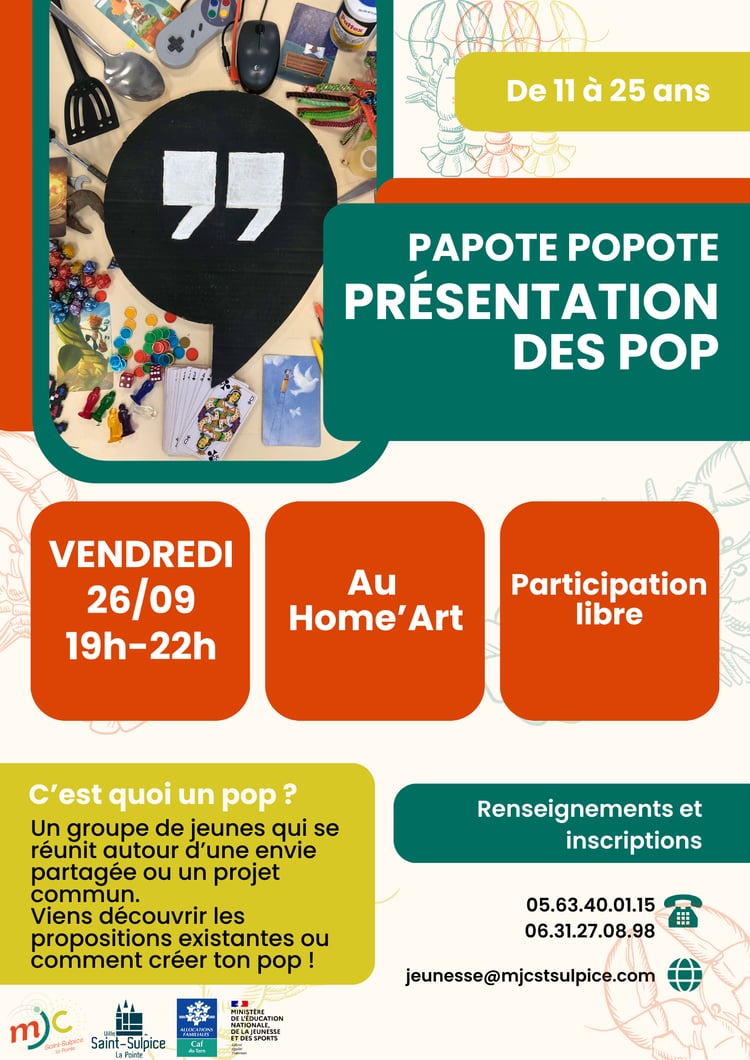 Cette saison, les POP’ (les groupes de jeunes rassemblés autour d’une passion commune) sont de retour ! Lors de cette soirée on vous présente les POP’ existants (Minecraft et Jeu de rôle), on crée de nouveaux groupes, on échange sur les POP’ en cours de création (Jeu de rôle débutant, Minecraft coopératif, lecture, jardinage, Défis Ingénieur AKA Les Morpekos…) mais on est aussi motivés pour récolter tes idées de POP’. Ah et on mange ensemble aussi ! Vendredi 26 septembre, de 19h à 22h, participation libre. |