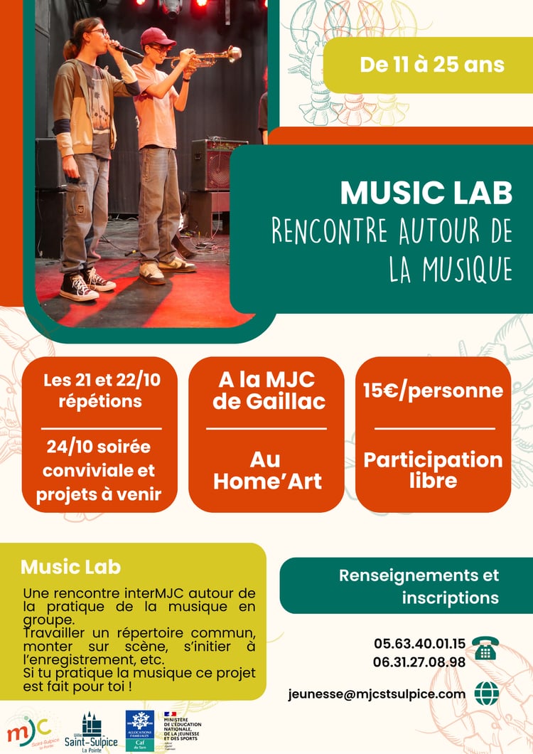Envie de rejoindre un collectif de jeunes motivés-ées par la musique ? La MJC te propose temps de rencontre convivial pour te présenter tout ce qu’il est possible de faire cette saison: visite et prise en main du studio, journées de répétition à la MJC de Gaillac, stage de pratique inter-MJC… Samedi 27/09, de 15h à 16h30, participation libre. |