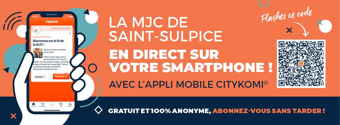 Citykomi est une application gratuite, qui ne récolte pas vos données personnelles et qui prend peu de mémoire sur votre téléphone. Elle vous propose de recevoir en notification les informations de la MJC et d’accéder à un fil des actualités récentes (les évènements passés s’effacent). En recevant une notification, vous pouvez l’ignorer, y réagir ou la partager par SMS, mail ou What’s App.